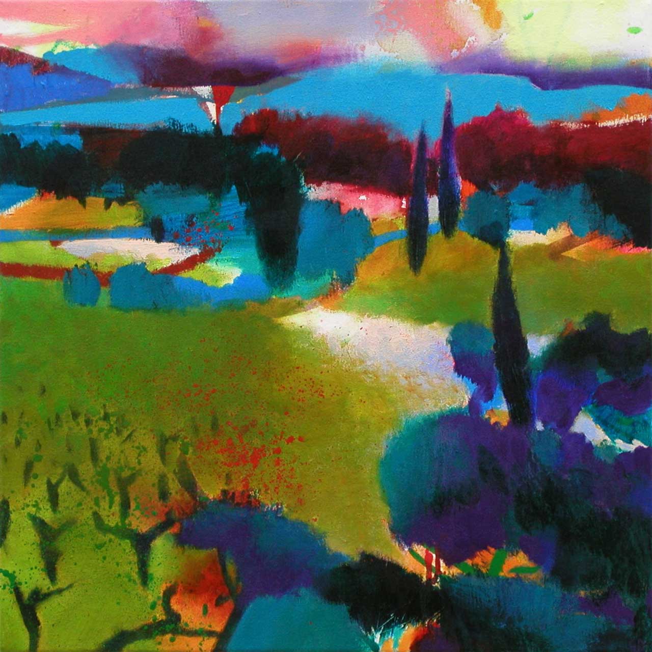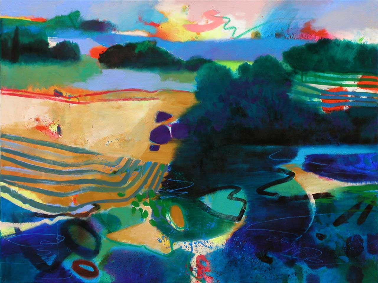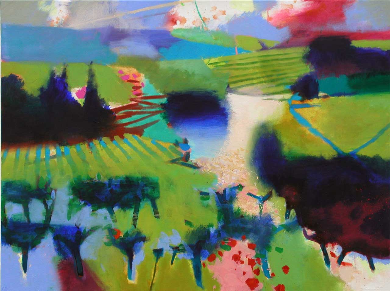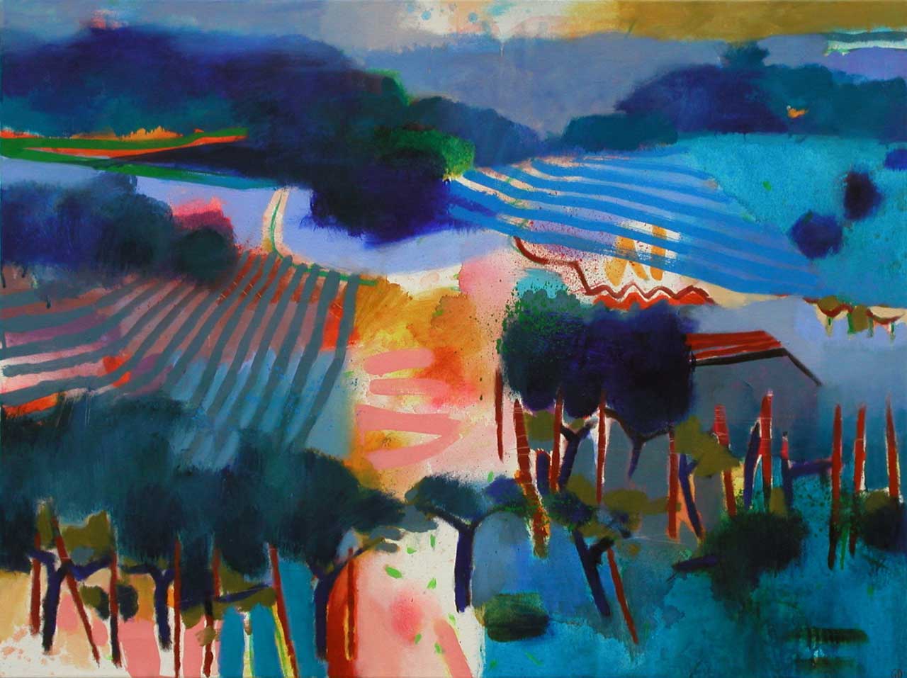 These paintings evoke the beauty of light reflected on French rivers such as the Lot, Dordogne, Aveyron and Tarn as well as the geometry of the vineyards in the South West, whose regularity contrasts with the uncultivated surrounding landscape where wild herbs and scrub oak abound. The use of strong colour is a response to the intensity of the heat and light in the south.