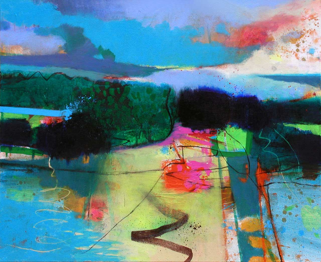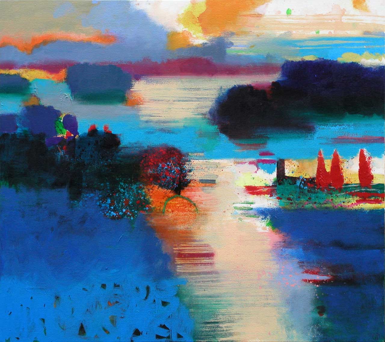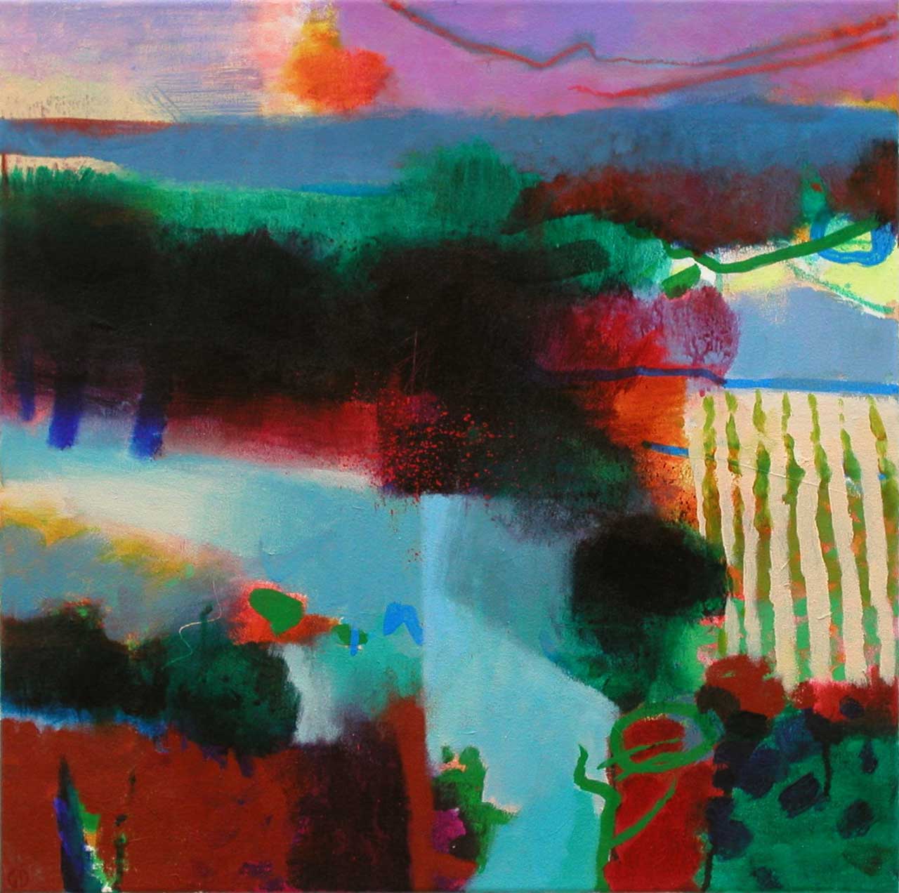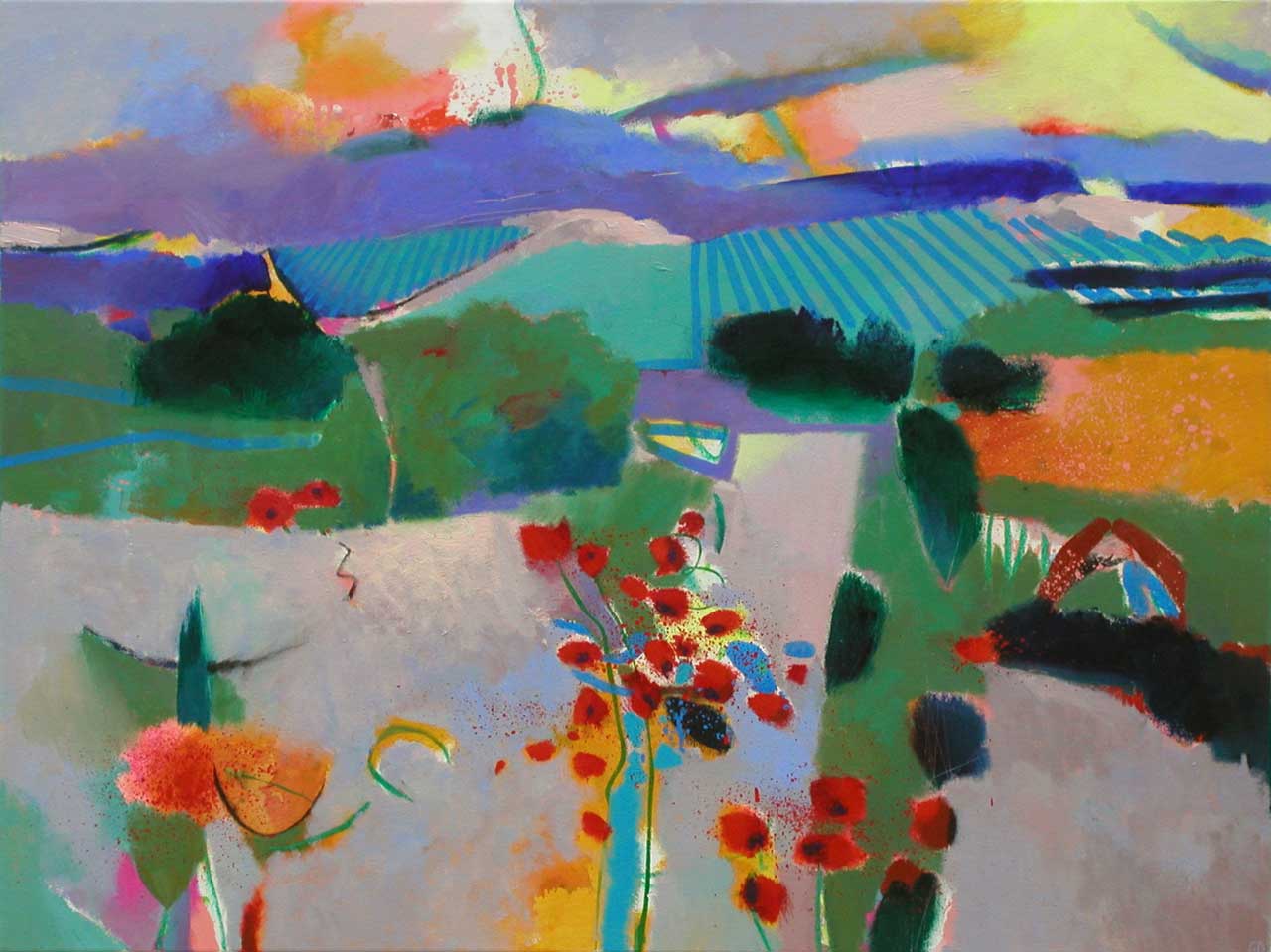 These paintings evoke the beauty of light reflected on French rivers such as the Lot, Dordogne, Aveyron and Tarn as well as the geometry of the vineyards in the South West, whose regularity contrasts with the uncultivated surrounding landscape where wild herbs and scrub oak abound. The use of strong colour is a response to the intensity of the heat and light in the south.