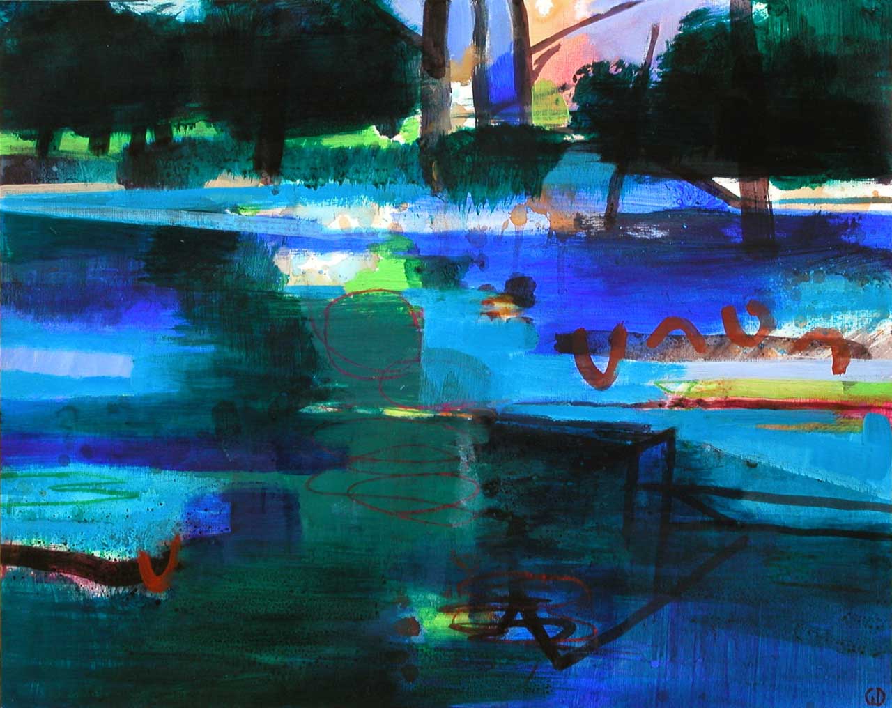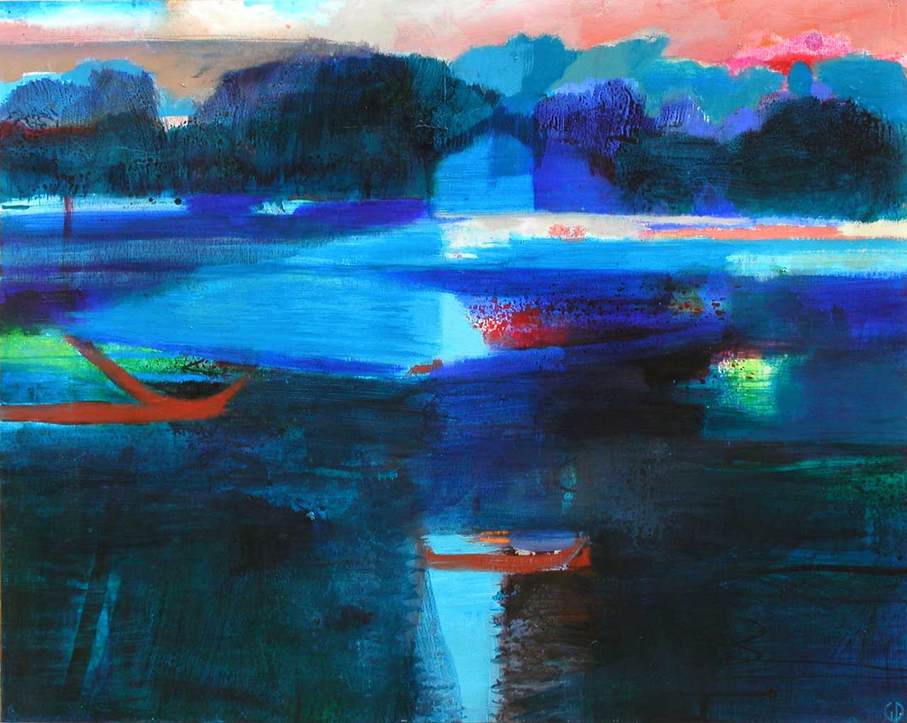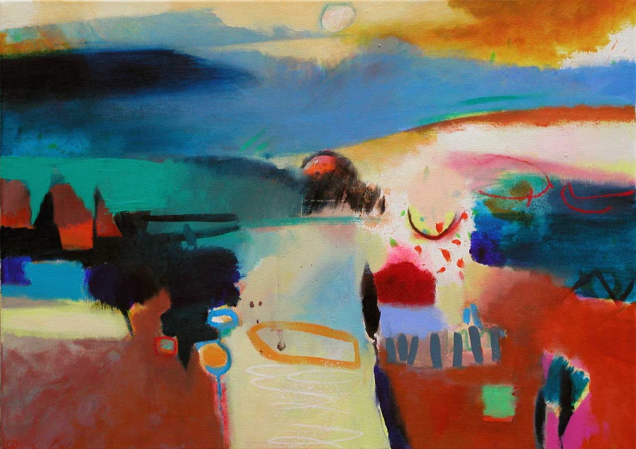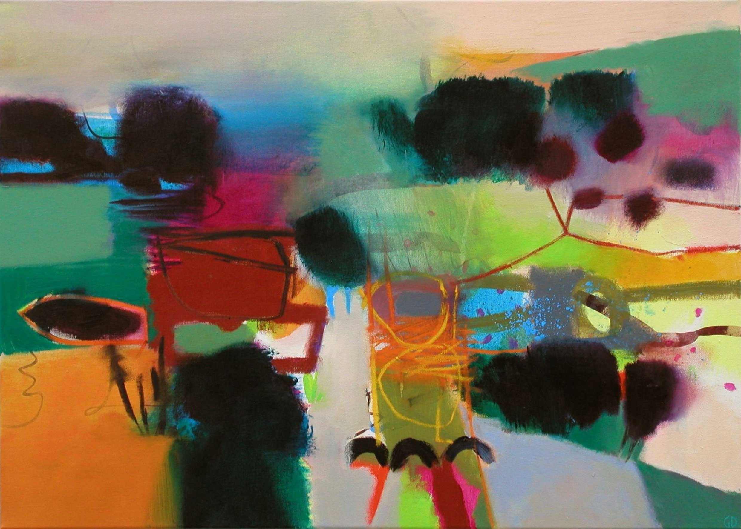 These paintings evoke the beauty of light reflected on French rivers such as the Lot, Dordogne, Aveyron and Tarn as well as the geometry of the vineyards in the South West, whose regularity contrasts with the uncultivated surrounding landscape where wild herbs and scrub oak abound. The use of strong colour is a response to the intensity of the heat and light in the south.