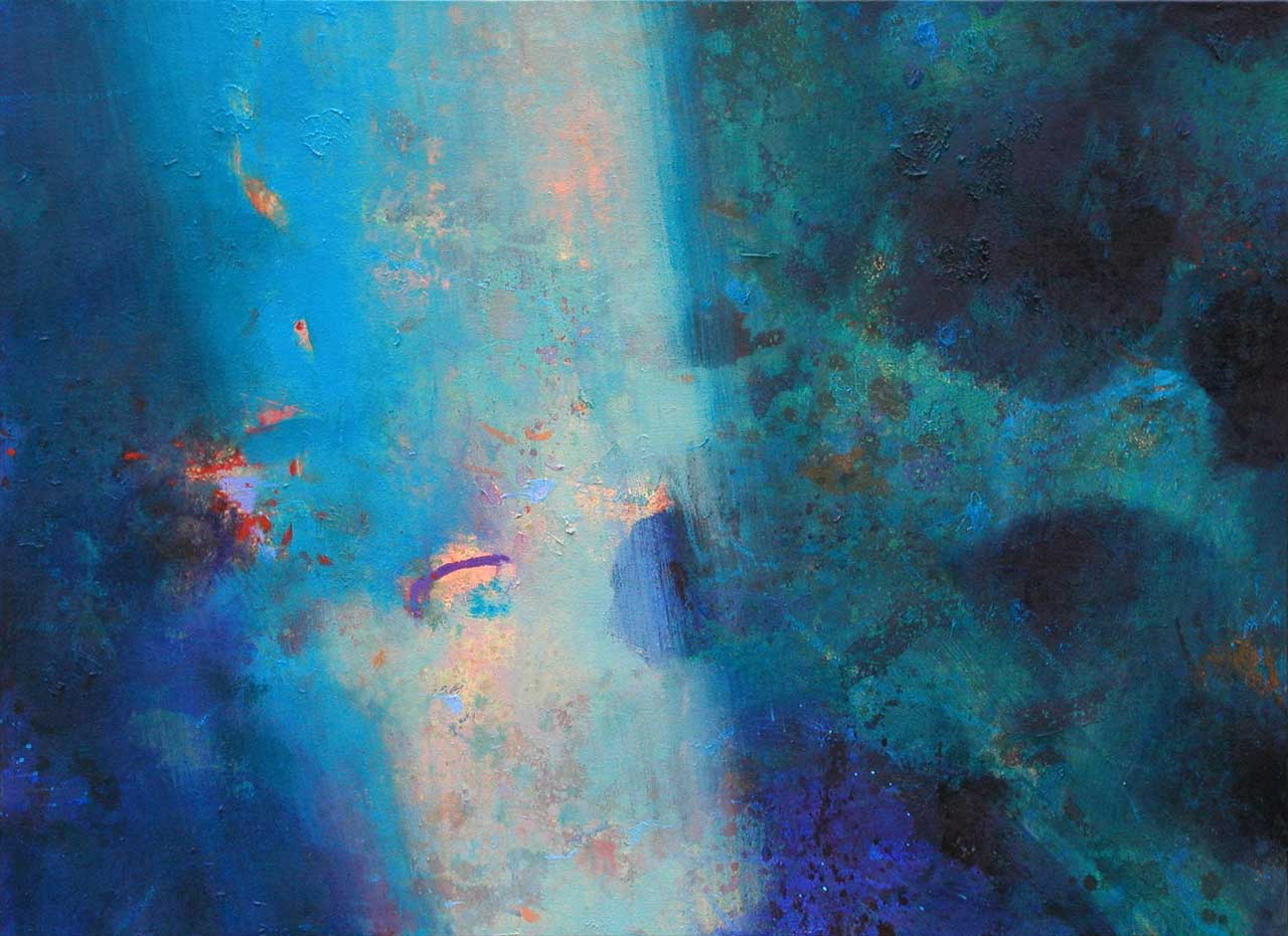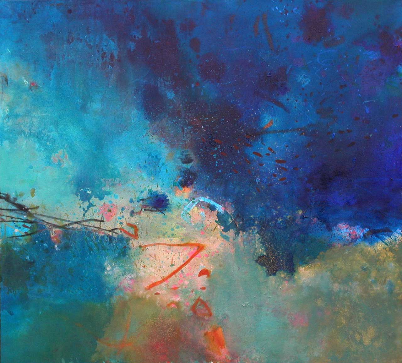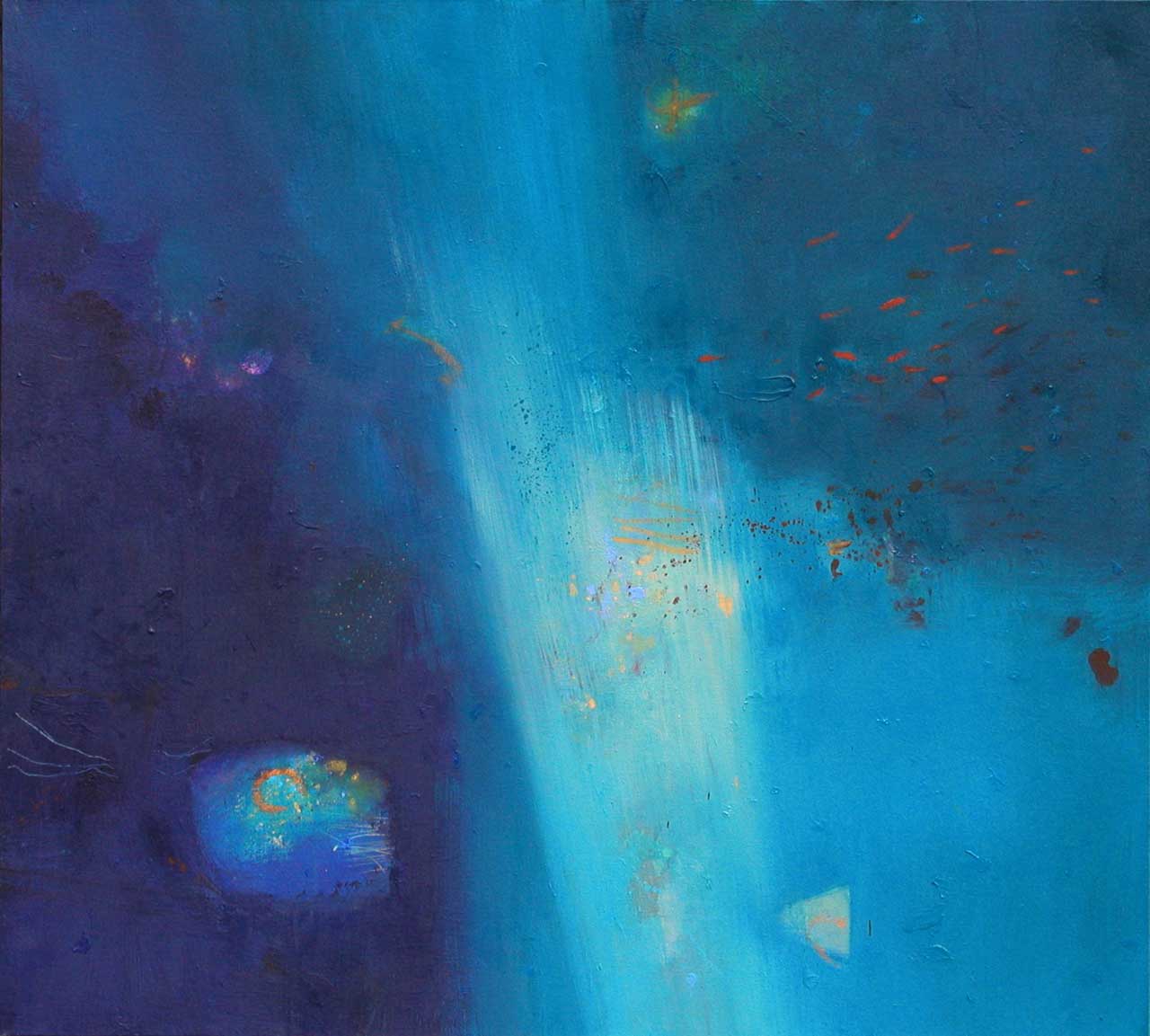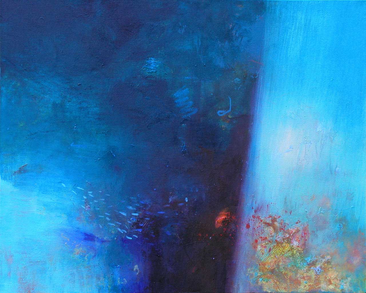 Above all, these works celebrate the beautiful diversity of blues which characterise the Aegean sea, its remarkable clarity enabling minute observation of the rock and plant forms on the seabed, and the fleeting shapes of passing fish. The fluidity of the paint has been allowed free rein, and literal description of this marine context has been avoided in favour of a lyrical evocation, which invites the viewer to interpret the content in a personal and imaginative way.