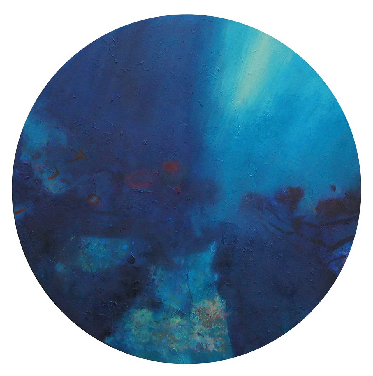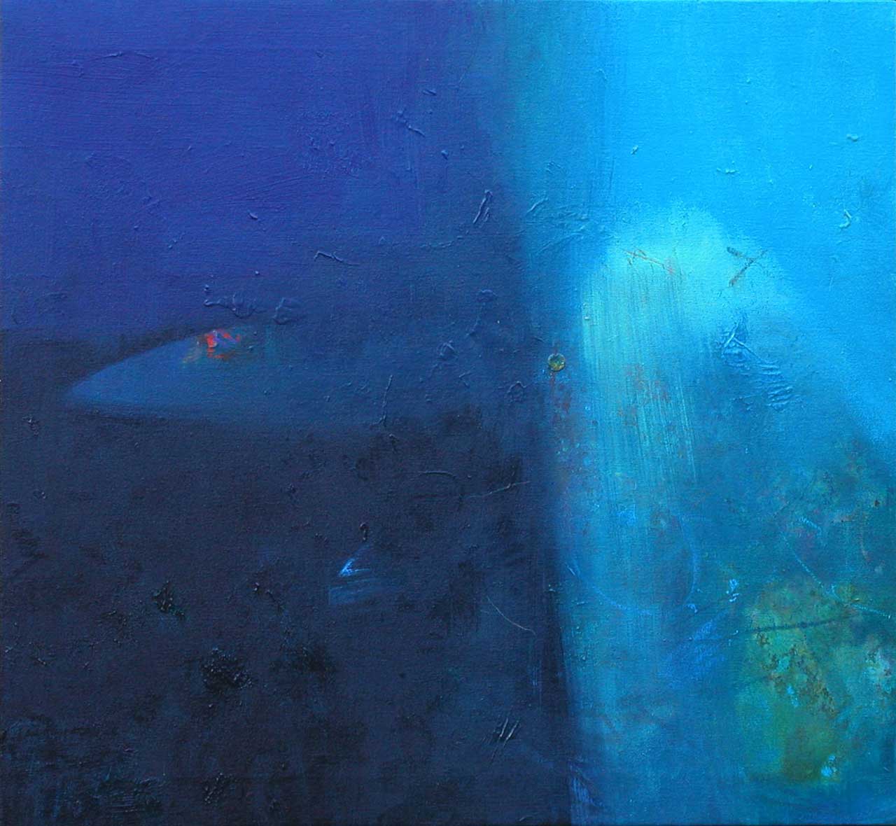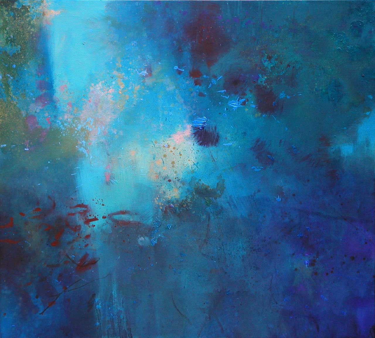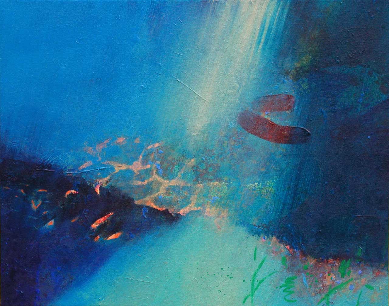 Above all, these works celebrate the beautiful diversity of blues which characterise the Aegean sea, its remarkable clarity enabling minute observation of the rock and plant forms on the seabed, and the fleeting shapes of passing fish. The fluidity of the paint has been allowed free rein, and literal description of this marine context has been avoided in favour of a lyrical evocation, which invites the viewer to interpret the content in a personal and imaginative way.
