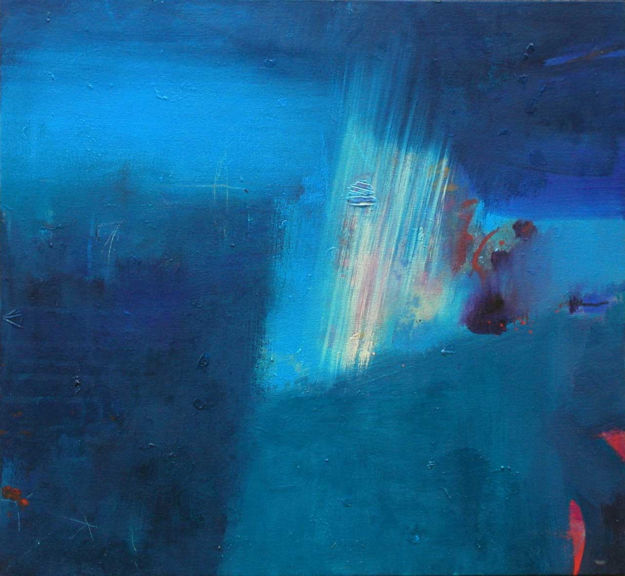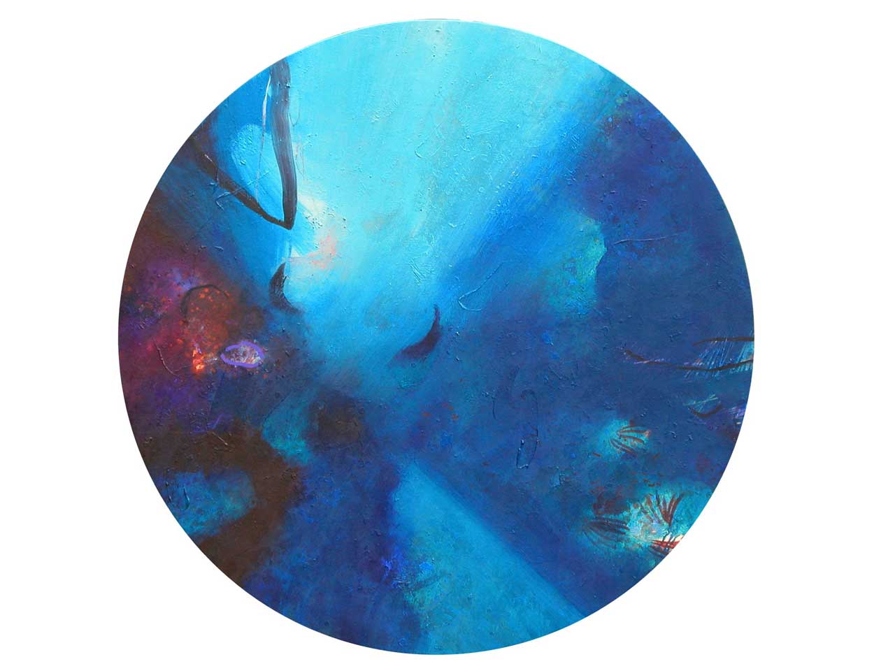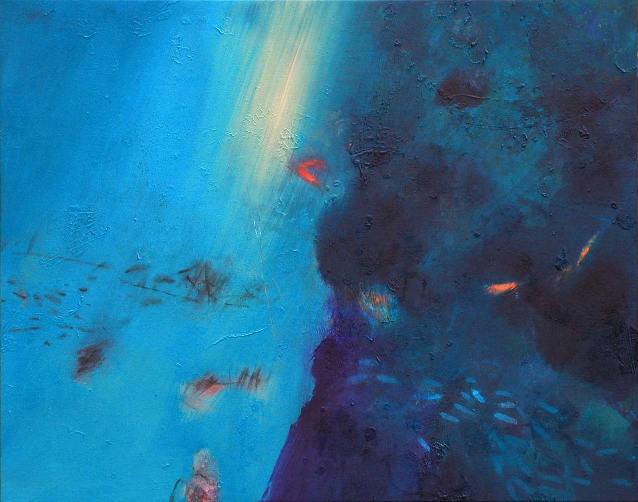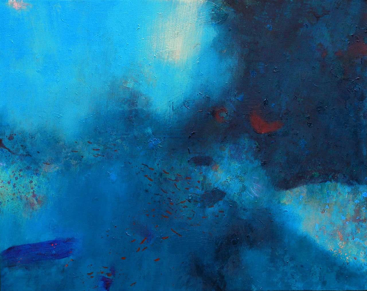 Above all, these works celebrate the beautiful diversity of blues which characterise the Aegean sea, its remarkable clarity enabling minute observation of the rock and plant forms on the seabed, and the fleeting shapes of passing fish. The fluidity of the paint has been allowed free rein, and literal description of this marine context has been avoided in favour of a lyrical evocation, which invites the viewer to interpret the content in a personal and imaginative way.