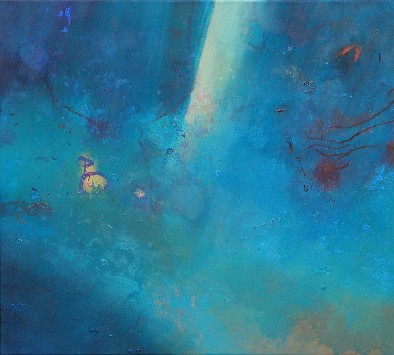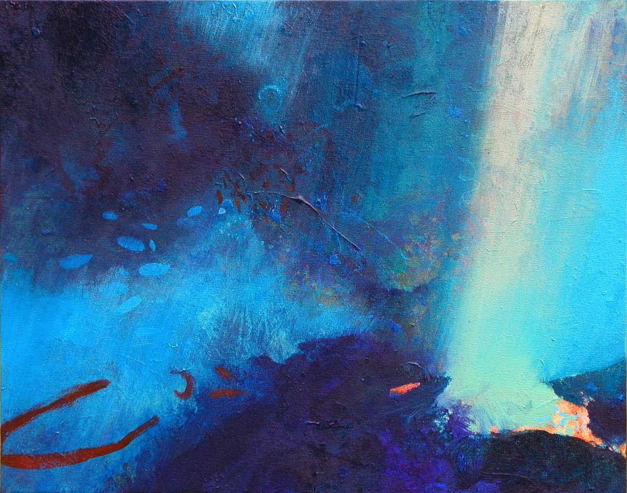 This series was inspired by snorkelling off the coast of the Greek islands of Tilos and Alonnisos. Shafts of light create diagonal axes which give structure to the composition, creating a sense of tension with the loose and experimental mark-making. Translucent glazes of colour suggest that the viewer is below the water’s surface, inhabiting an undersea world of mystery and intrigue.